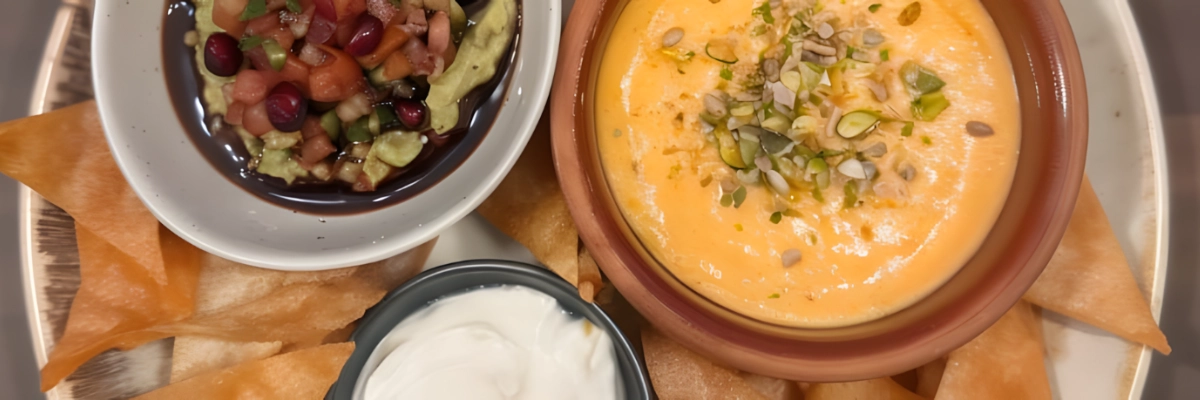 Dried tomatoes, chickpeas, cheese and mix herbs dip. Avocados, tomatoes, onion and cucumber and cilantro dip with pomegranates. Sour cream. Enjoy the dips with Turkish crisps.